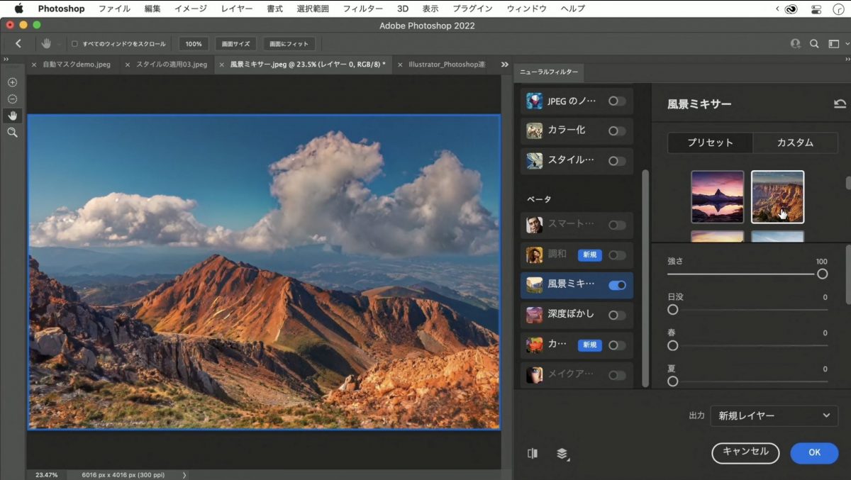 風景ミキサーは、風景写真に、違う風景のテクスチャーを合成することができるフィルター。日本の山の風景を、アメリカ西部風な赤茶けた岩山にしたり、雪山にしたり、新緑の春にしたりすることができる。雪から出た岩肌や草木の様子を見ても何の違和感もないのには驚かされる。もはや、写真の季節さえも信じられなくなってしまうが、特定の場所の違う季節の写真が欲しい場合に重宝しそうだ。