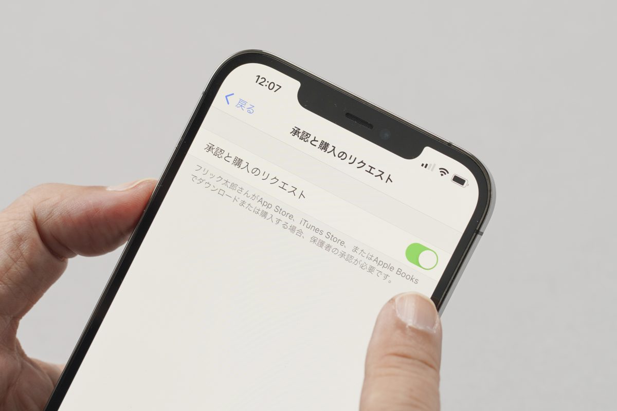 親のデバイス側からファミリー共有で子供のアカウントを開いて、『承認と購入のリクエスト』をオンに。すると、子供のiPhoneでアプリを買おうとすると保護者に『承認をリクエスト』するように表示が出るようになる。