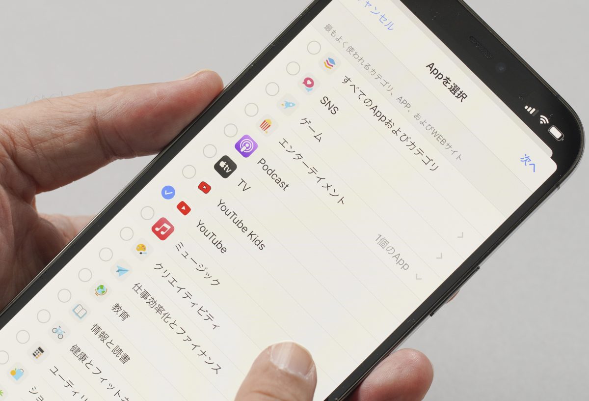 スクリーンタイムは保護者の『設定>iCloud ID>ファミリー共有>スクリーンタイム』から制御できる。アプリのカテゴリーごとに時間設定できるし、さらに特定のアプリの利用時間を細かく設定したりもできる。