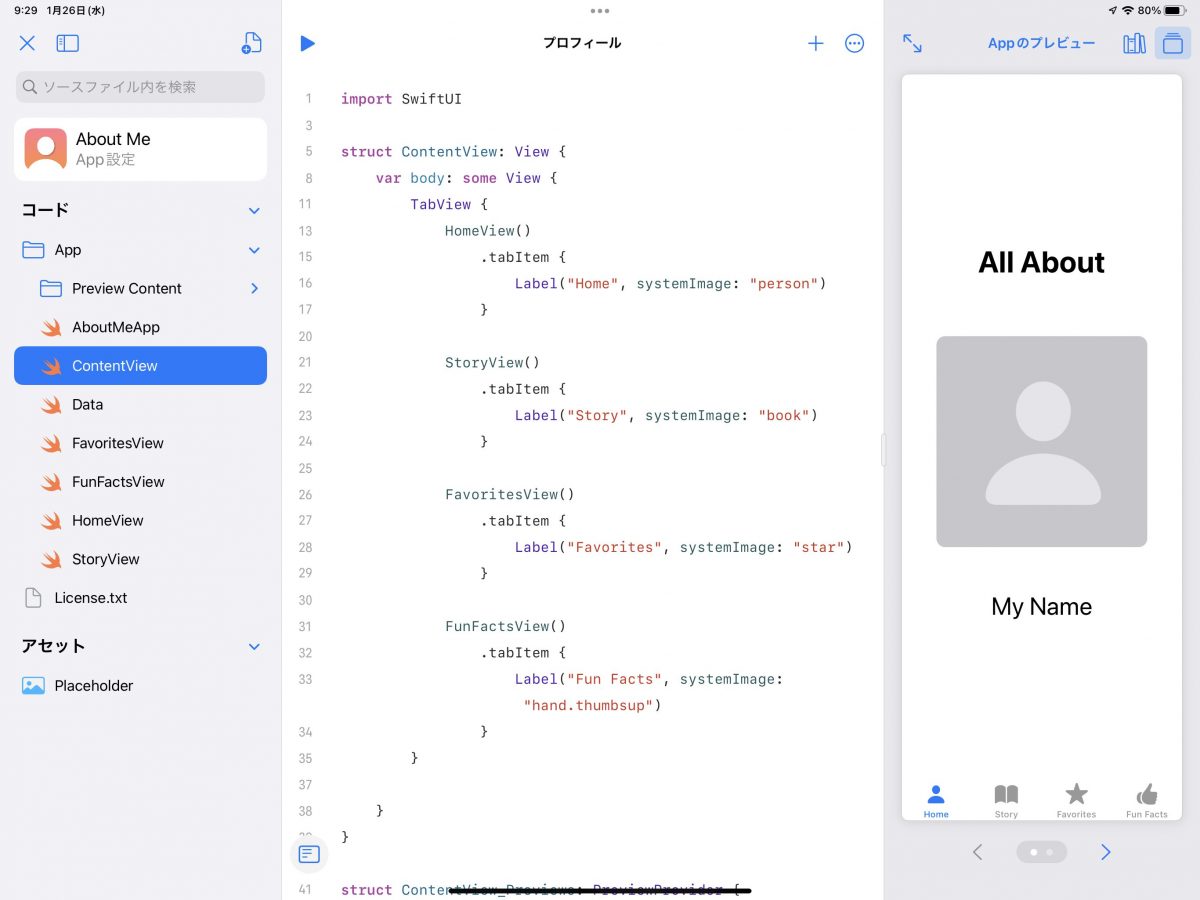 上の『ContentView』では、それぞれのタブにどんなアイコンと文言を使うのかが定義されていることが分かるだろう。
