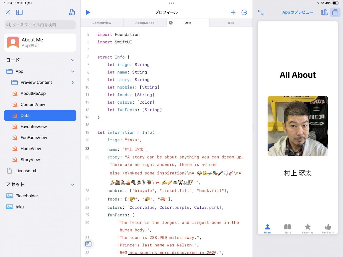 写真はアセットに置き、文章などは『Data』に置く。アプリのコードそれ自体と、データを分けて置く事で、アプリの他のどの部分からも同じデータを参照することができるようになる……という基本的なことを学ぶこともできる。