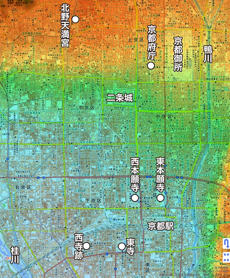 ちなみに京都の地形を細かく見ると、北が高くて南が低いというより、北東が高くて南西が低い。そんなん地元の人しか知らんわ。