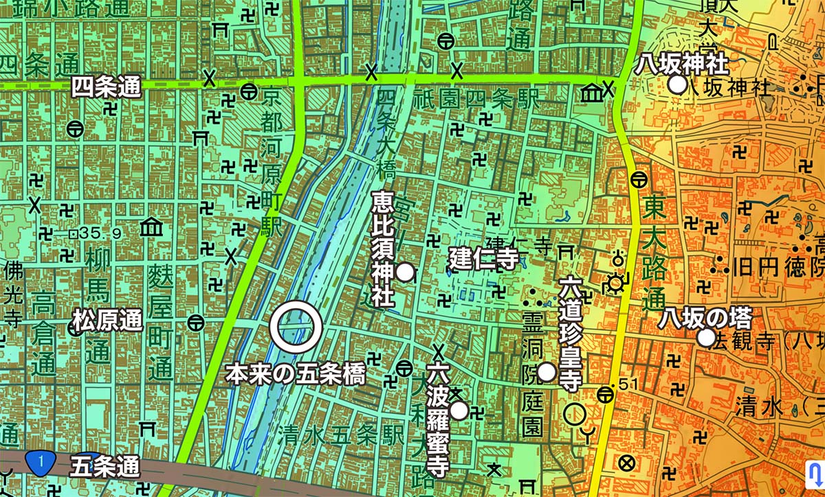 いわれてみると確かに、四条と五条は妙に離れてるし、五条天神は松原通沿いにあるし、六道の辻や六波羅探題跡といった平安時代の史蹟もあるし、東へ歩いて行くと清水寺に辿り着くから、平安京時代からの古道だったってのはすごく分かる。牛若丸と弁慶が決闘したという『京の五条の橋の上』は今の五条大橋ではなく、この松原橋だったのだ。五条通ってさすが国道1号だわ、五条大橋もさすがデカいわ、とか思ってたのがなんか悔しい。でもガイドブックとかで『ここがかつての五条大橋でした』といわれるより、古地図でどかんと示される方がインパクトがあってよいですな。リアルにそれを感じられる。