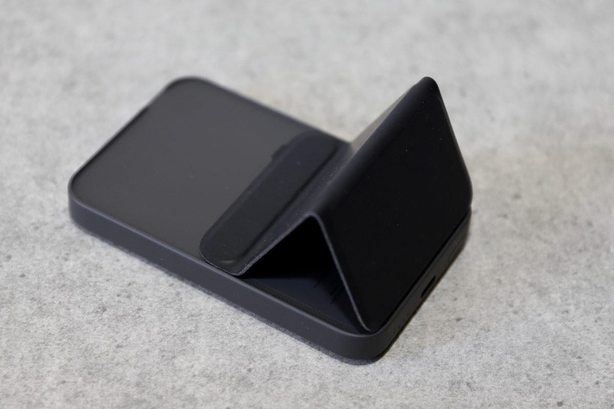 『Anker 622 Magnetic Battery』はiPhoneの背面にマグネットでくっつくバッテリー。容量は5,000mAh。日常のシーンでいえば、iPhoneを使っていて、ちょっと充電ケーブルには繋ぎたくないけれど、バッテリー残量が足りない……というような時に便利そう。「パチン」とiPhoneの裏に貼り付けさえすれば容量が追加されるという便利なアイテムだ。また、裏側のスタンド部分を引き起こすと、デスクの上に立てることもできる。