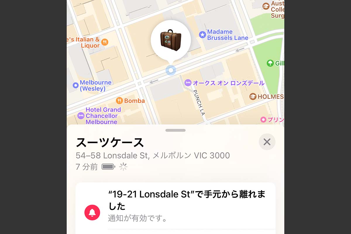 今回、筆者は家族でメルボルンに旅行に行ったが、旅行中のお互いの位置、日本に残してきた家族の位置、スーツケースの位置、貴重品カバンの位置が分かって非常に便利だった。また、AirPodsやMacBook Proなどの位置も通知される(これは常時分かるわけではないが……後述)。
