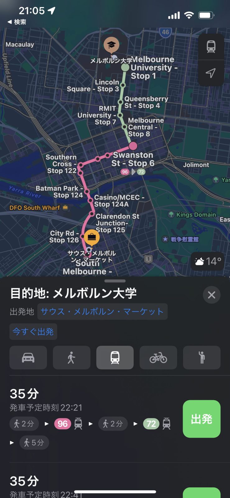 メルボルンのビクトリアマーケットからメルボルン大学へは、96番と72番のトラムを乗り継いで行けば22:21分に着く。こんなこと昔は絶対にわからなかった。