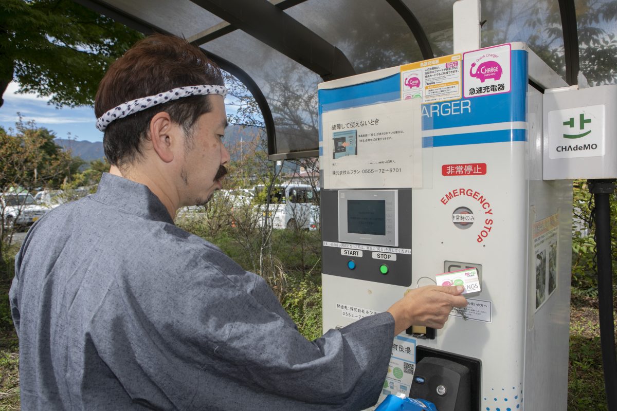 まずは東名高速を走り、海老名ジャンクションから圏央道に入り北上。八王子から中央自動車道に入り河口湖を目指す。途中談合坂でひと休み。ここまで77kmだが、とにかく電気がなくなっては困ると、ビビッて、15分ほどの間にも追加で充電。