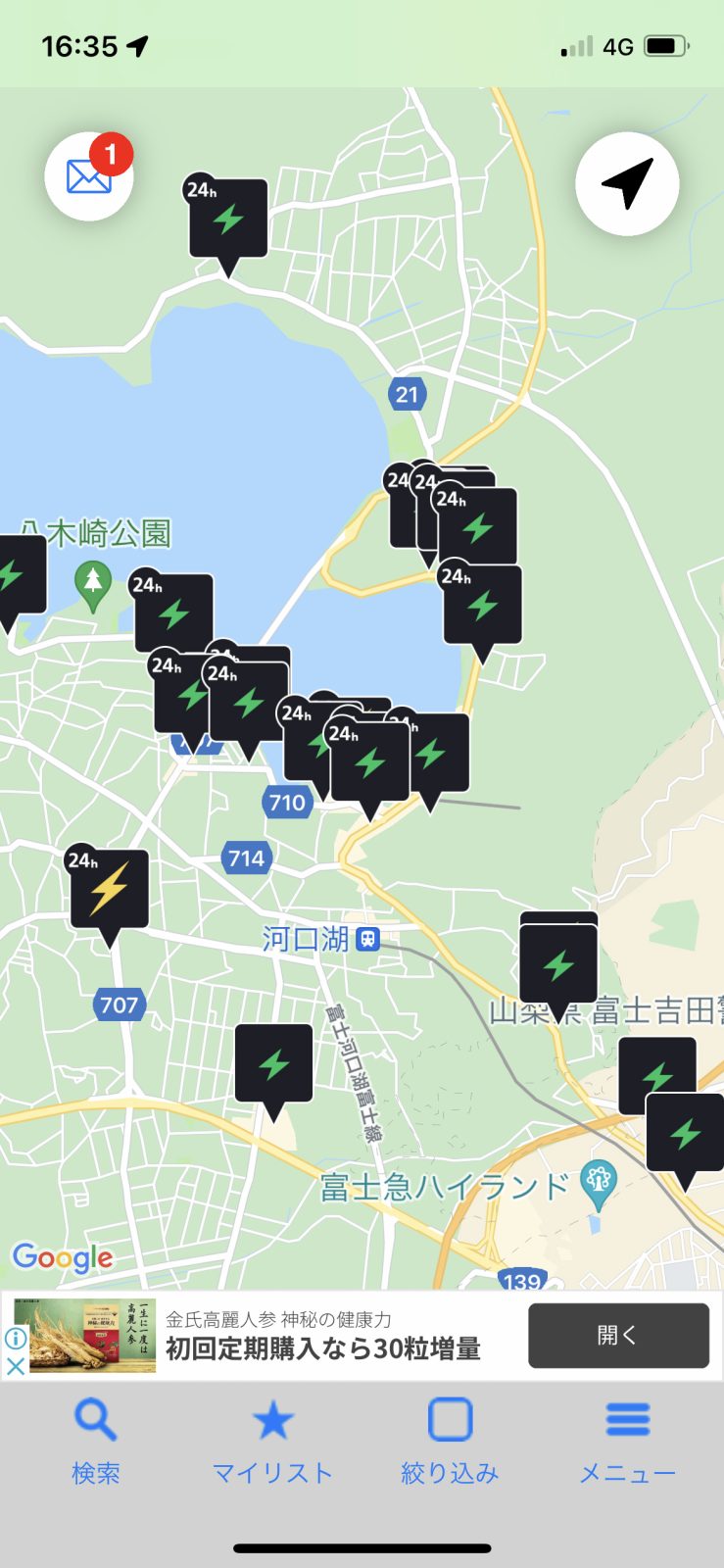 河口湖畔で食事をしながらフル充電。10年前にも充電に使った富士河口湖町役場で充電したが、10年前と違うのは、その周りに何十という充電スポットがあり、それがスマホで探せること。時代は変わった。こと関東近郊においては、充電場所に困るということはないだろう。しかし、充電にはそれなりに時間がかかるから「その間に食事に行こう」という話になるのは10年前と変わらない(笑)。
