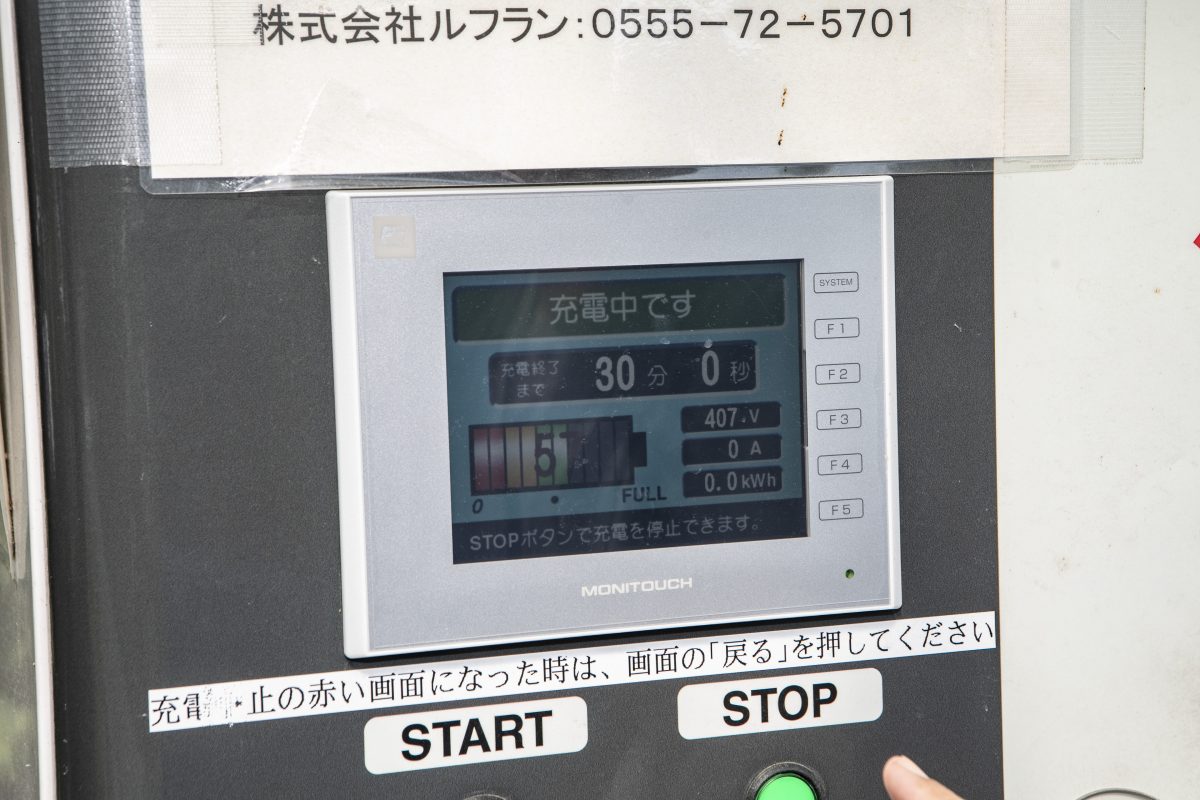 まずは東名高速を走り、海老名ジャンクションから圏央道に入り北上。八王子から中央自動車道に入り河口湖を目指す。途中談合坂でひと休み。ここまで77kmだが、とにかく電気がなくなっては困ると、ビビッて、15分ほどの間にも追加で充電。