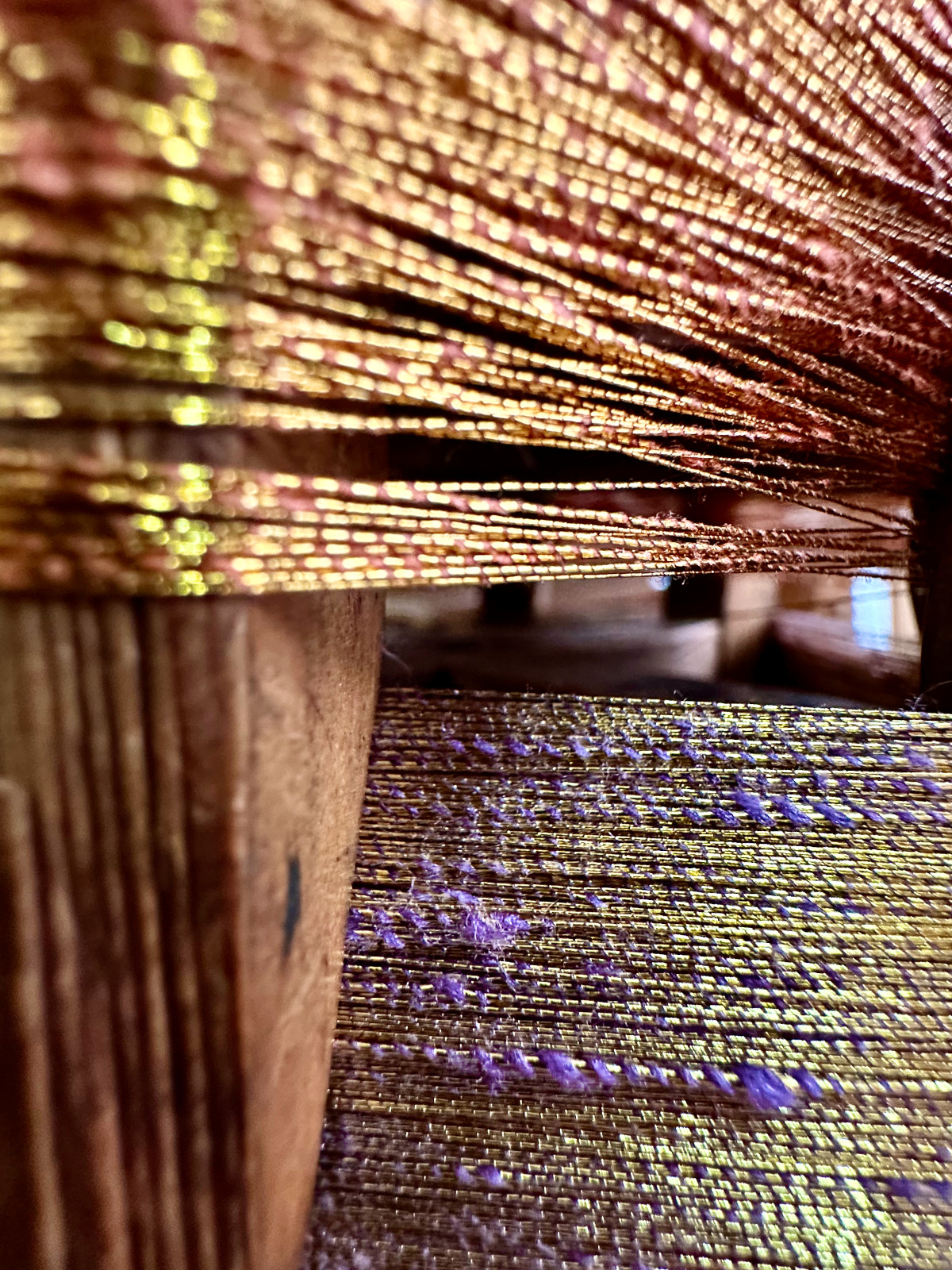 『西陣織 伝統工芸 桝屋高尾』の工房にて、美しい糸や織物を「マクロ」で撮影。織機で織られる糸を撮影すると、宇宙空間のようなまったく別のイメージに。色彩を糸の中に取り入れたオリジナルの金糸「ねん金糸」の残糸や残布でつくられたサンキャッチャーの質感もわかります。