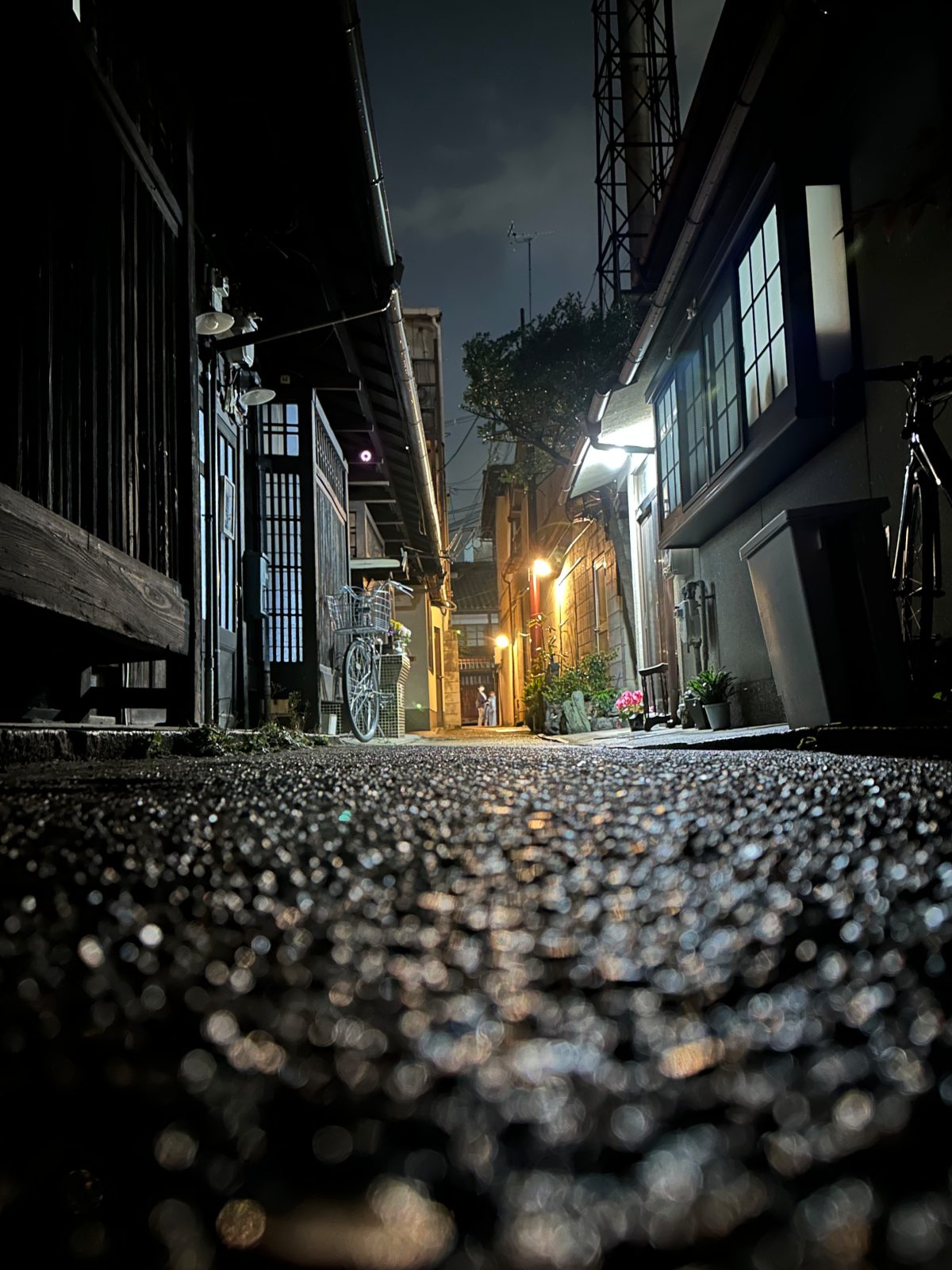 カメラを逆さまに持ち、角度をつけて前ぼけで撮影すると雰囲気のある路地の写真が撮れます。