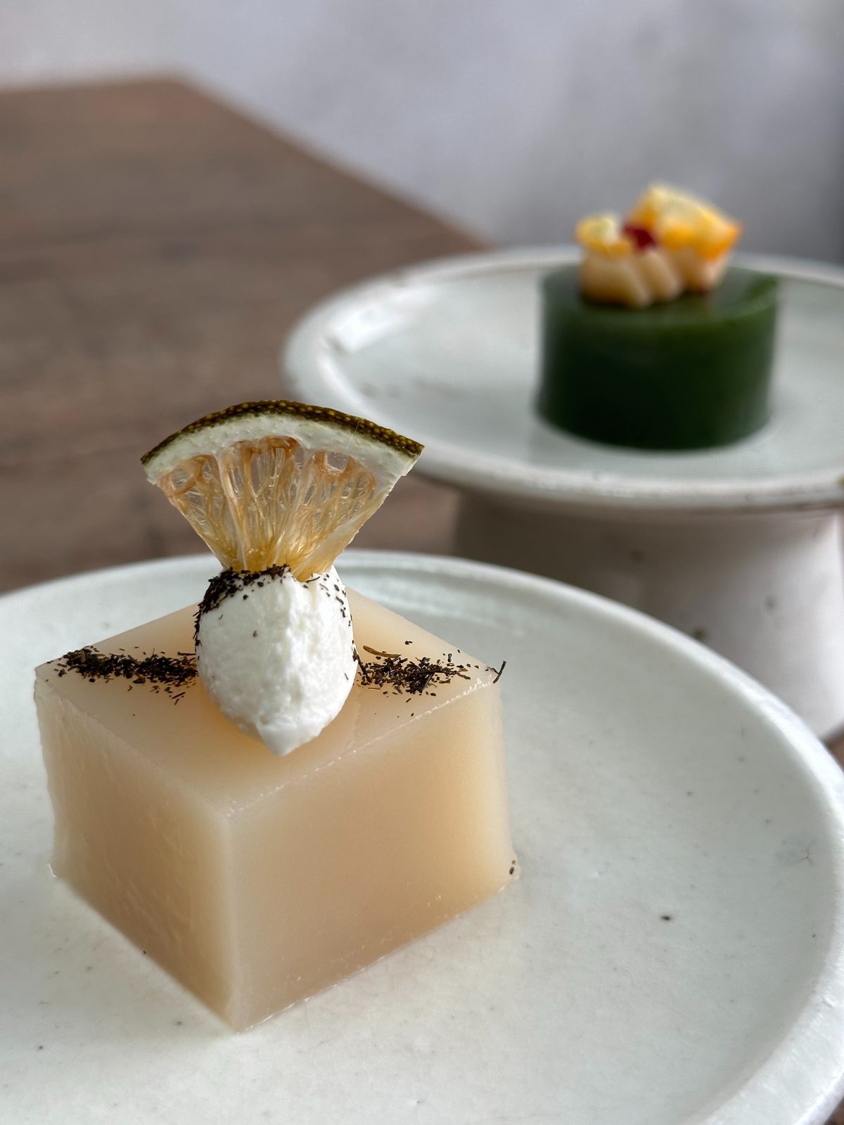 『うめぞの茶房』にて、餡を寒天とわらび粉で流し固めた「かざり羹(かん)」を撮影。食べ物は近寄って撮影することが多いと思いますが、「1x」で撮影すると形が少し歪みます。「2x」または「3x」で少し引いて撮影することで歪みにくく、また真上から撮影するとき自分の影が入ってしまう場合も影が入りにくくなります。