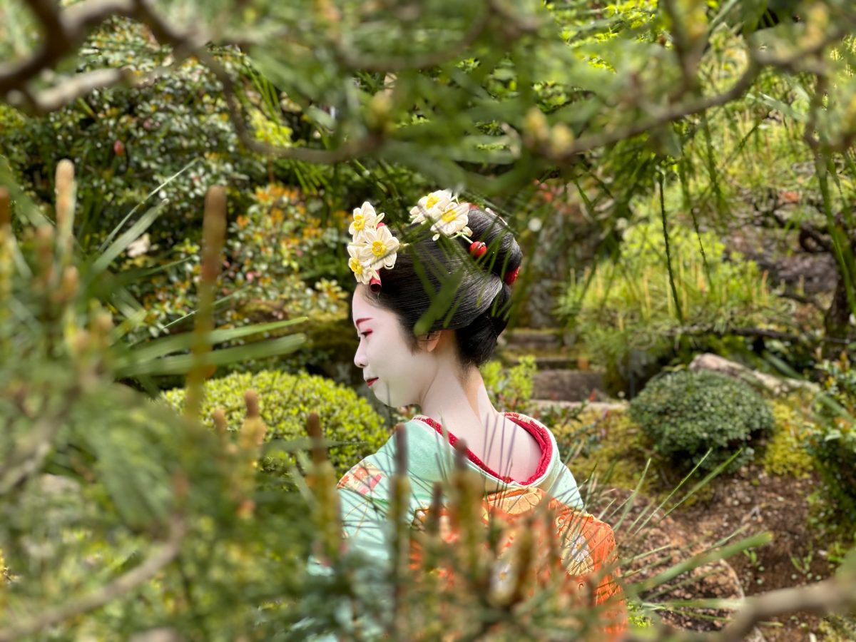 木々の間から舞妓さんを撮影し、前ぼけさせることで奥行きを感じる写真になりました。