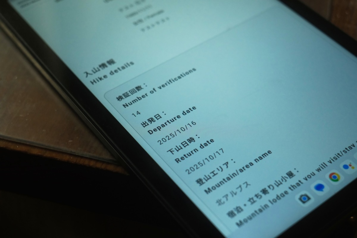 この取り組みは、デジタル庁が始めたもので、登山者はまず専用のサイトでマイナンバーカードを活用してID登録し、登山に関する情報を提出すると、立ち寄った山小屋に用意された端末を使ってQRコードを読み取る。すると、氏名、年齢、住所などの情報が山小屋が把握でき、データベースに立ち寄った履歴が残るというもの。