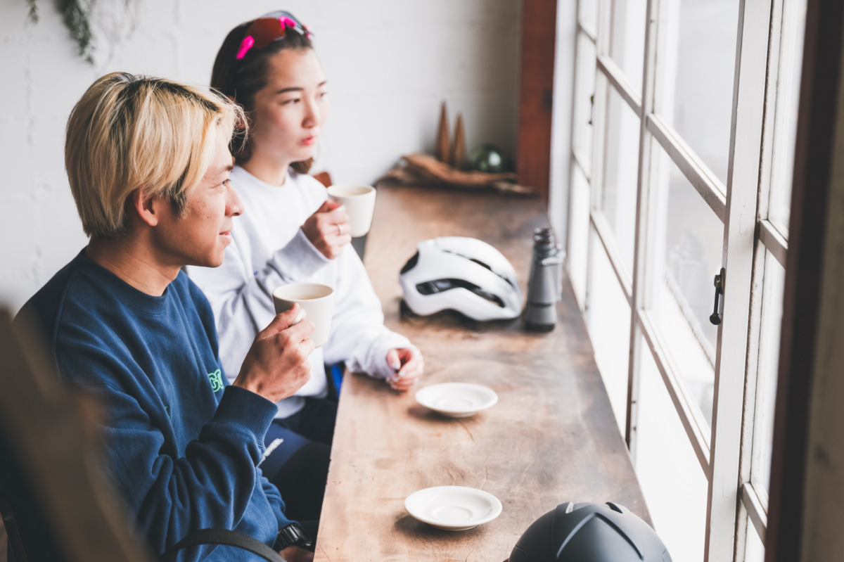 カフェの前に自転車を停め、コーヒーを飲みながらひと息つく。