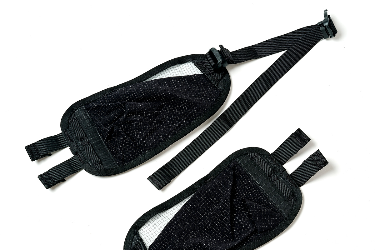 ショルダーハーネスに設けられたストレッチポケットは、ボトルやスマートフォンなどの収納に便利。必要に応じて手軽に着脱ができる。