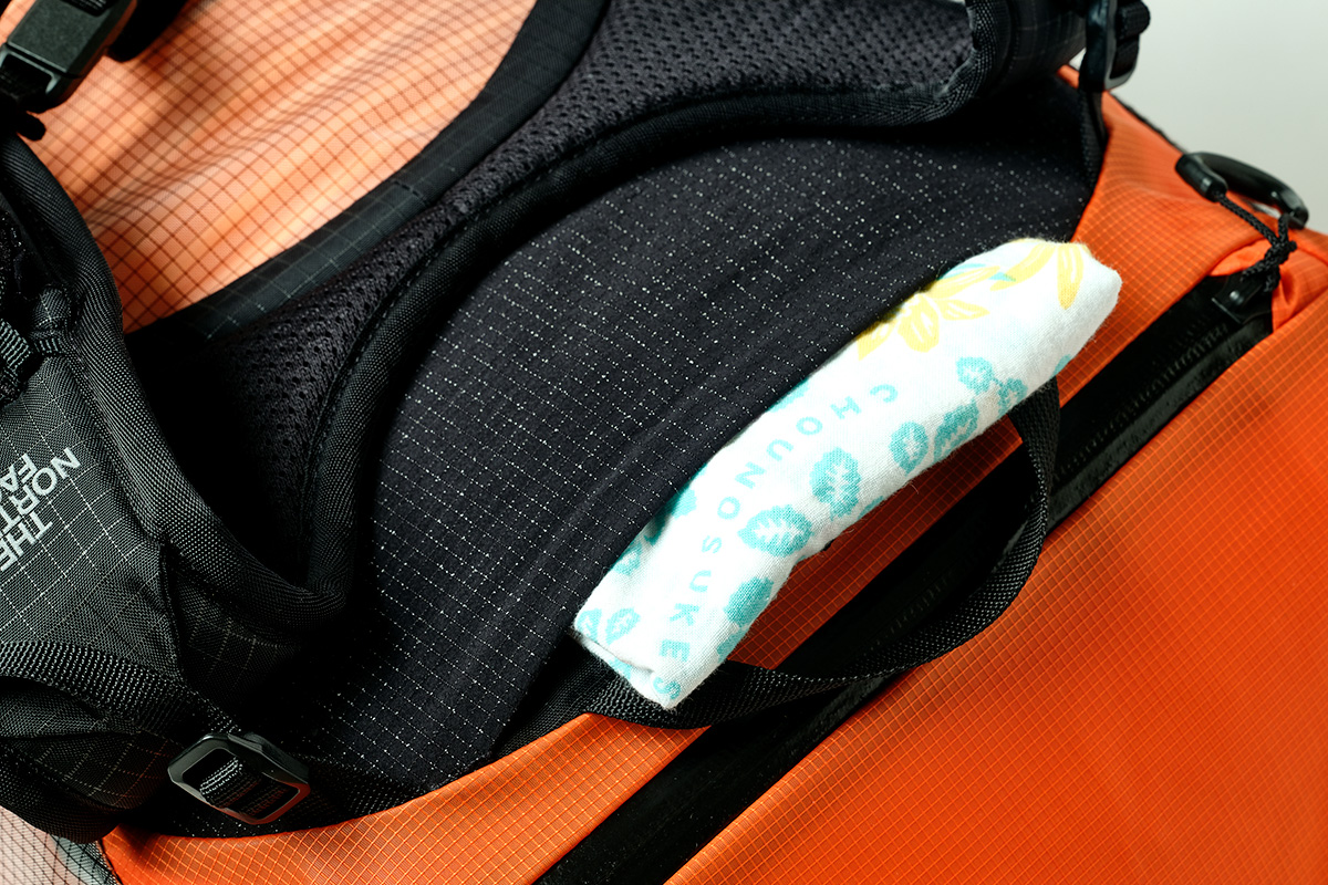 45ℓモデルには、背面のショルダーハーネスの付け根の間に、ミニマムなストレッチポケットを追加。ノールックで出し入れできる。