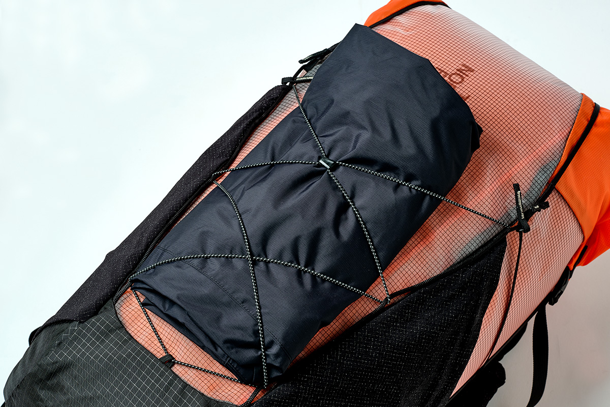 160デニールの太い単一繊維は、マルチフィラメントのように繊維の隙間に保水しないため、圧倒的な疎水性を発揮する。メッシュ構造の通気性も手伝って、優れた速乾性も確保。大量の汗をランナーの肌から遠ざける素材が、登山で雨から荷物を守る役割へ。アクティビティの枠を超えた技術融合の結果だ。