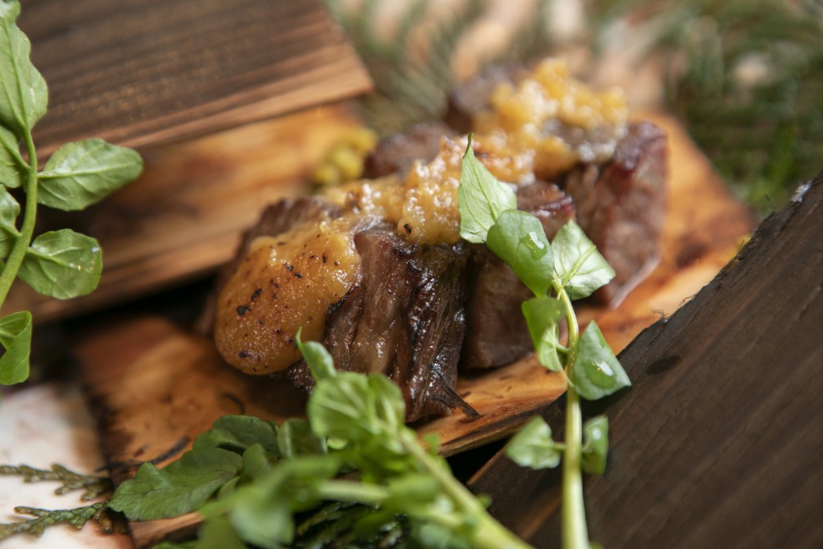樹海のほど近く、溶岩温泉に併設されているお食事処「巻狩」。創業50年の老舗旅館であり、富士山溶岩プレートの製造・販売元でもある。日本国内の一流ホテルやレストランに卸しているだけあり、その味は格別だ。