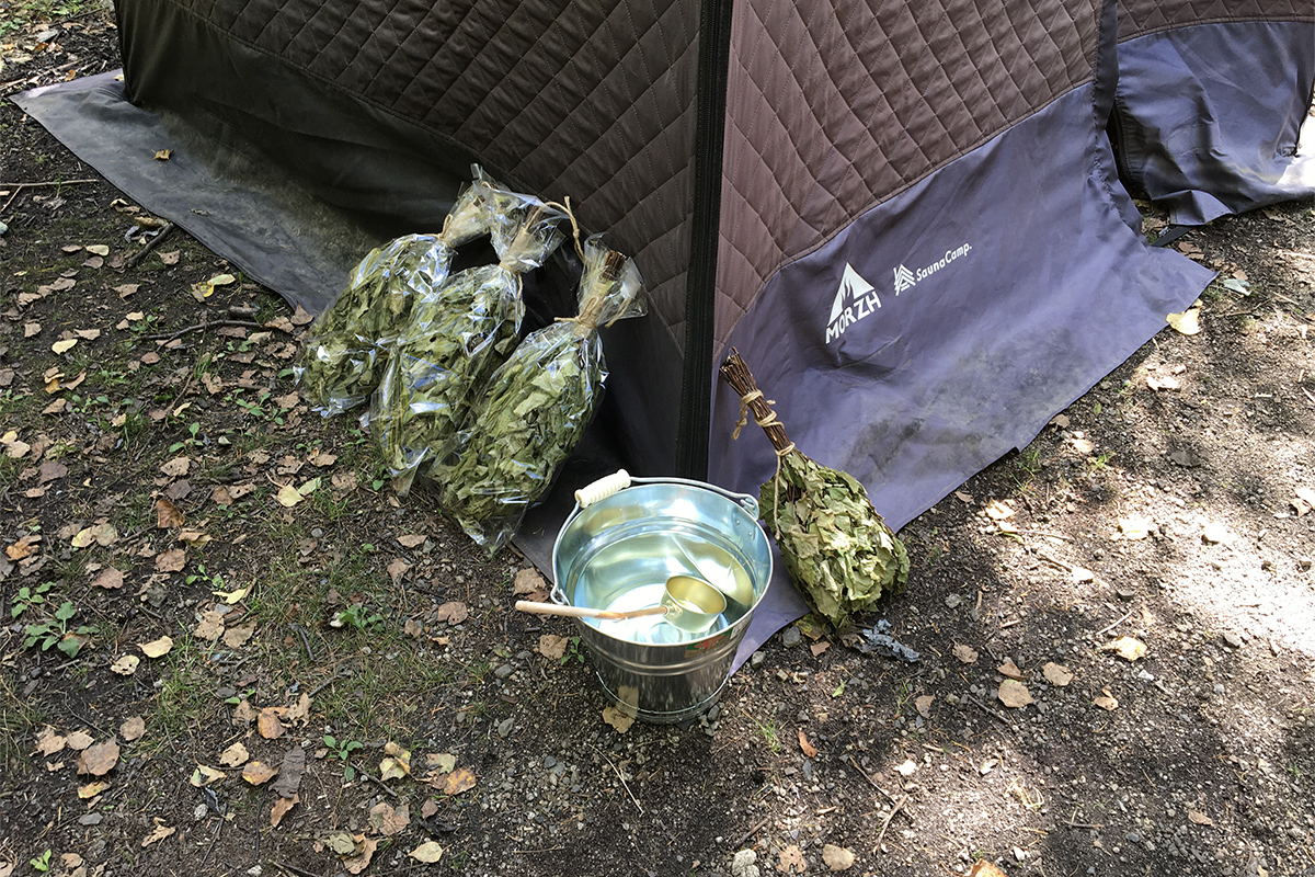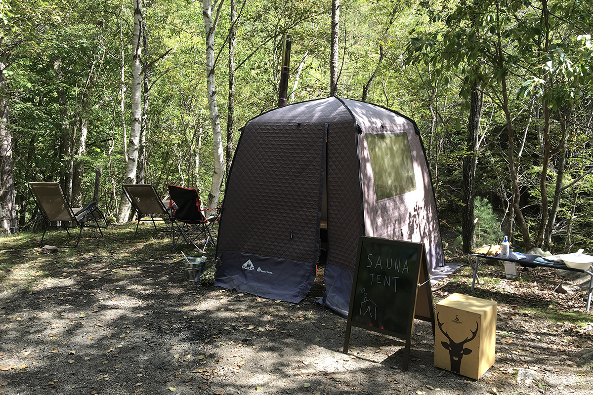 サウナテントとは、テント型のサウナに入って温まった後、近くの川や湖に入って、熱った体を冷やし、ベンチなどで外気を浴びながらリラックスするアクティビティ。