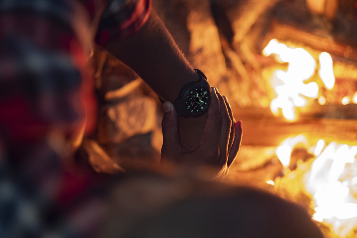 時計針と文字盤が発光するため、暗い場所でもライトなしで時間が素早く確認できる。またインデックスが画面外周のベゼルに配置されているため、Instinctシリーズの画面でアナログフェイスを選択したときよりも面積が大きく見やすいのが特長だ。