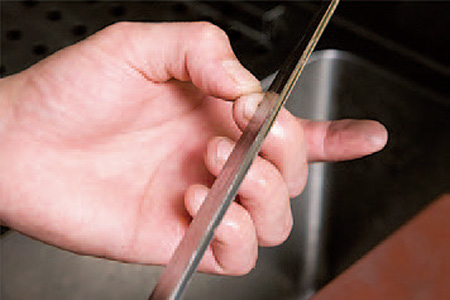 親指と人さし指で、包丁の腹を押さえる持ち方。