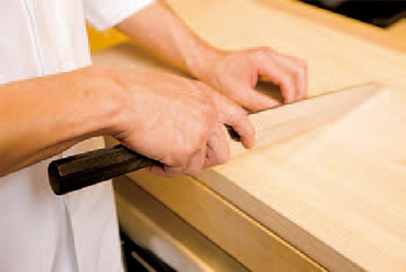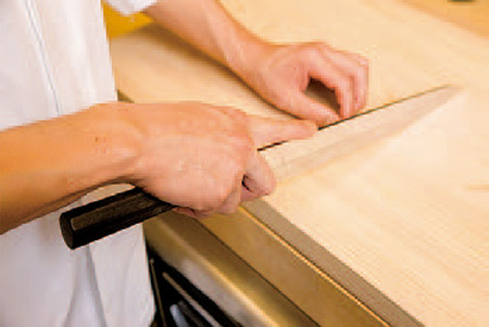 刺身包丁など刃渡りの長い包丁も、安定させて持つことで、刃のブレを抑えて正確に切ることができます。