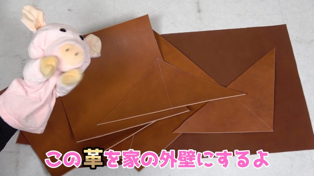 誰もが良く知っている童話「三匹の子豚」。オオカミに食べられそうになる子豚の三兄弟が、それぞれお家を作って身を守るお話です。そこで、耐久性抜群の革で作ったお家なら、きっと子豚さんを助けられるハズ! ということで検証スタートです。
