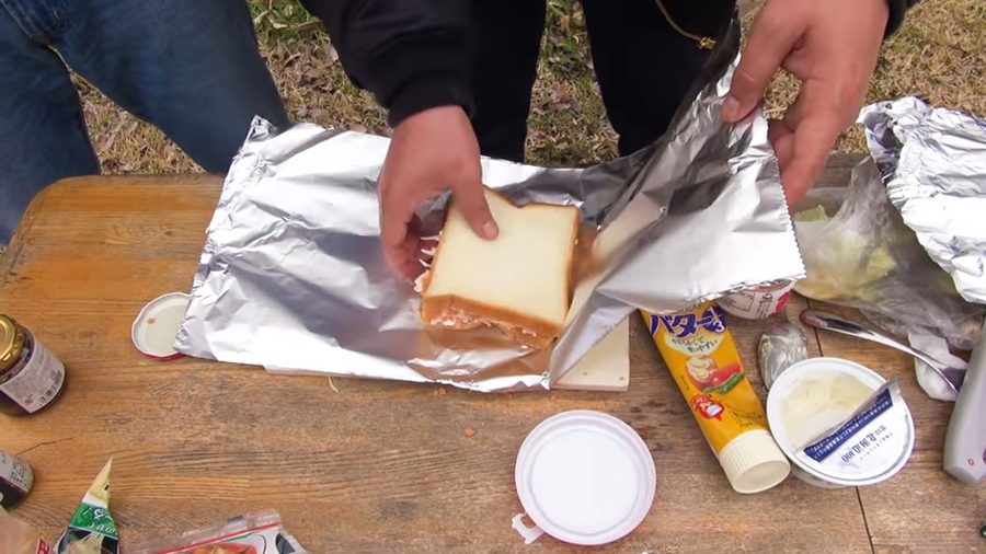 手焼きタイプのホットサンドメーカーは屋外でもホットサンドが作れるキャンパーの人気アイテムですが、意外とかさばるのも事実。食パンに好きな具材を挟んで、もっと気軽にホットサンドを楽しみたいセバスチャンの二人は、アルミホイルを使ったホットサンドを作ることに。