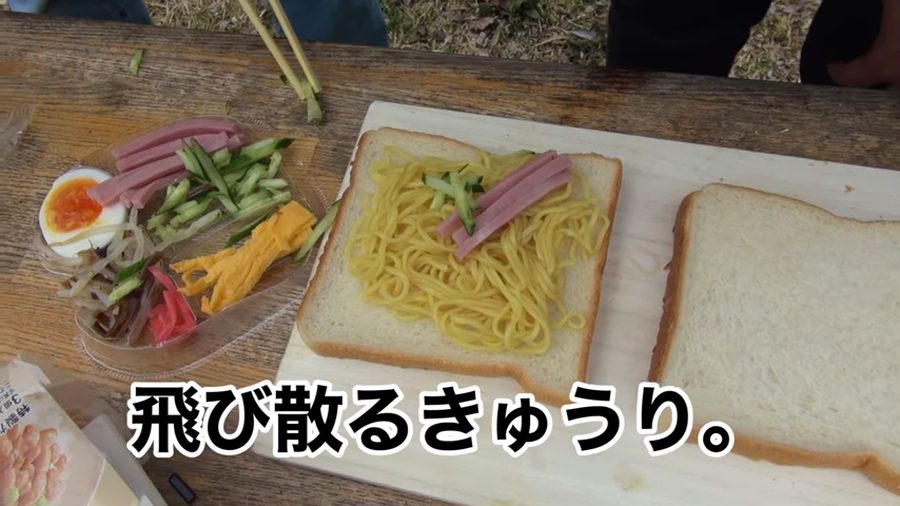 なかでもインパクトが大きかったのは冷やし中華! 食パンの上に麺を並べ、丁寧にハムやキュウリを並べる原田。付属のタレもばっちりかけます。