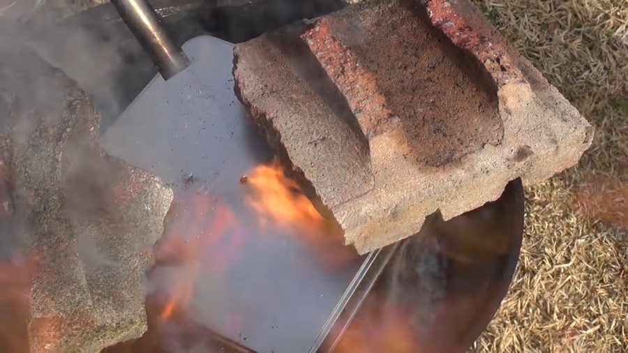 BBQ台は底に穴を開けた缶。あとは炭に火をつけるだけ! 最初は枯草の影響でよく燃えますが、すぐに落ち着きました。