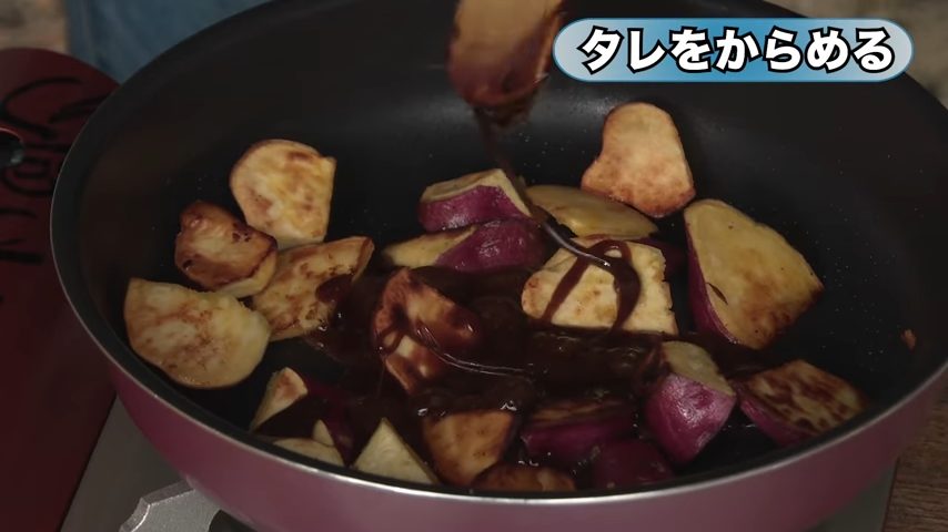 そのタレを炒めたさつまいもに投入! しっかり絡めながら炒めましょう。