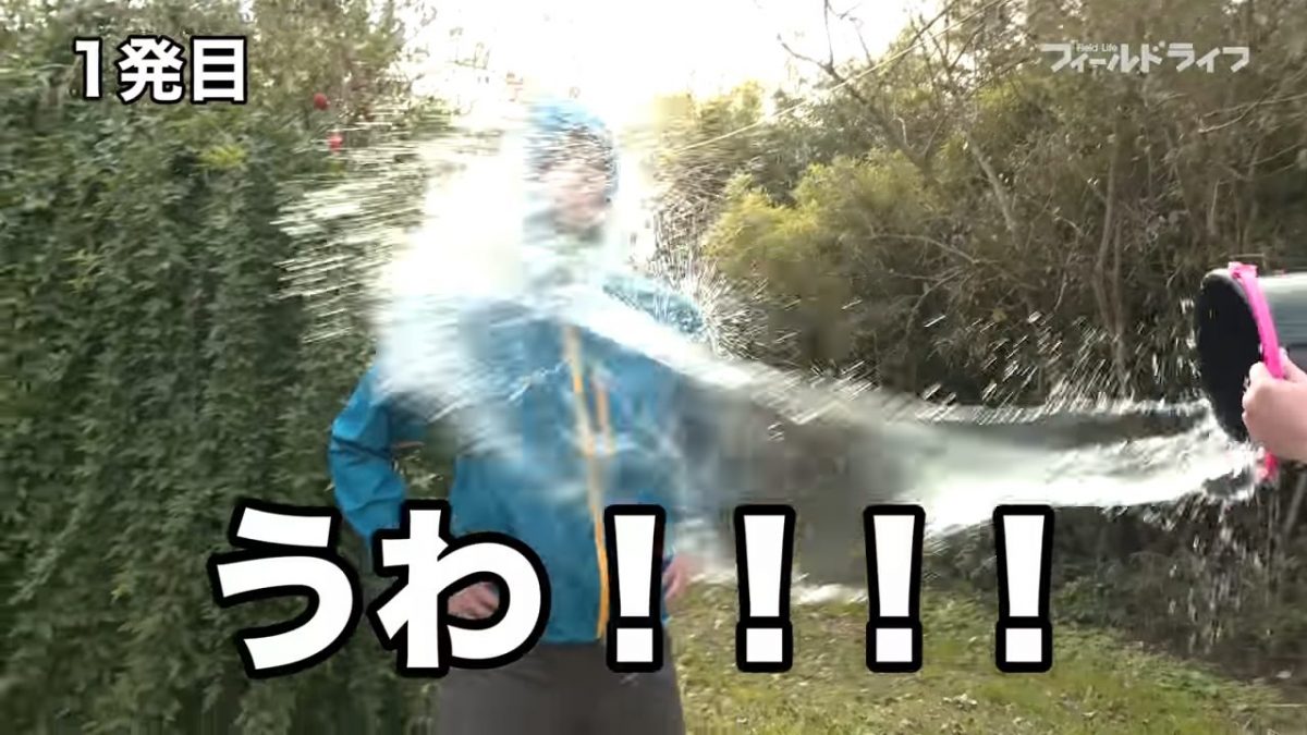 バケツに入った水を勢いよくかける原田。用意されたバケツ5杯分の水を浴びた阿部。普通の雨とは比べ物にならないほどの量ですが、果たして身体は無事なのか? 100均の雨カッパの奮闘と合わせてご覧ください。きっとゴアテックスが欲しくなりますよ!