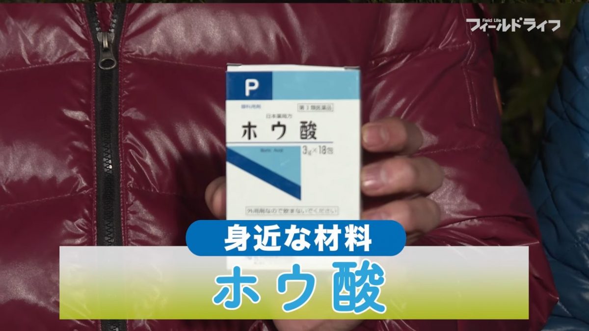緑の炎に欠かせない素材が、このホウ酸! 薬局でもよく見かけますよね。このホウ酸にあるものを加えて火をつけると……?!