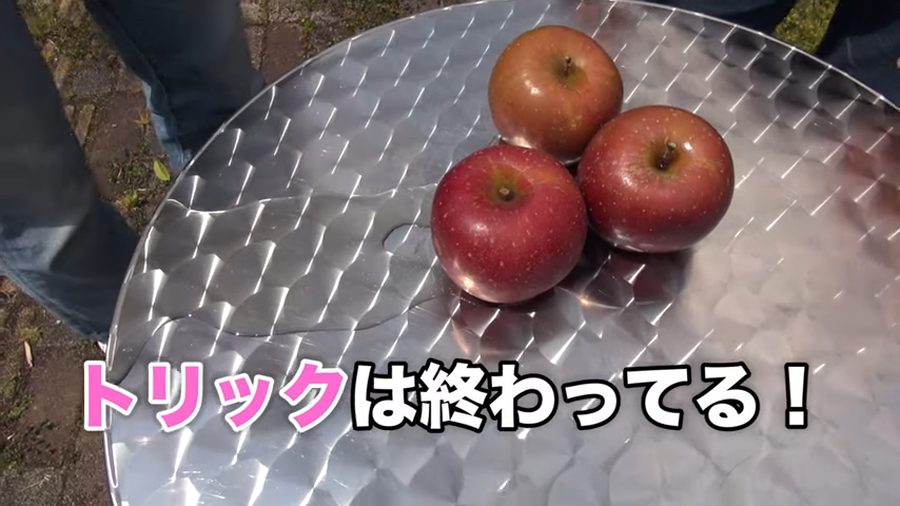 今回は非力な原田でもりんごを握りつぶせるよう、あらかじめある仕掛けを施しておきました。ヒントはりんごから滴る水!