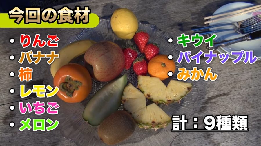今回の動画では、りんごやバナナ、柿、レモンなど9種類のフルーツを用意しました。