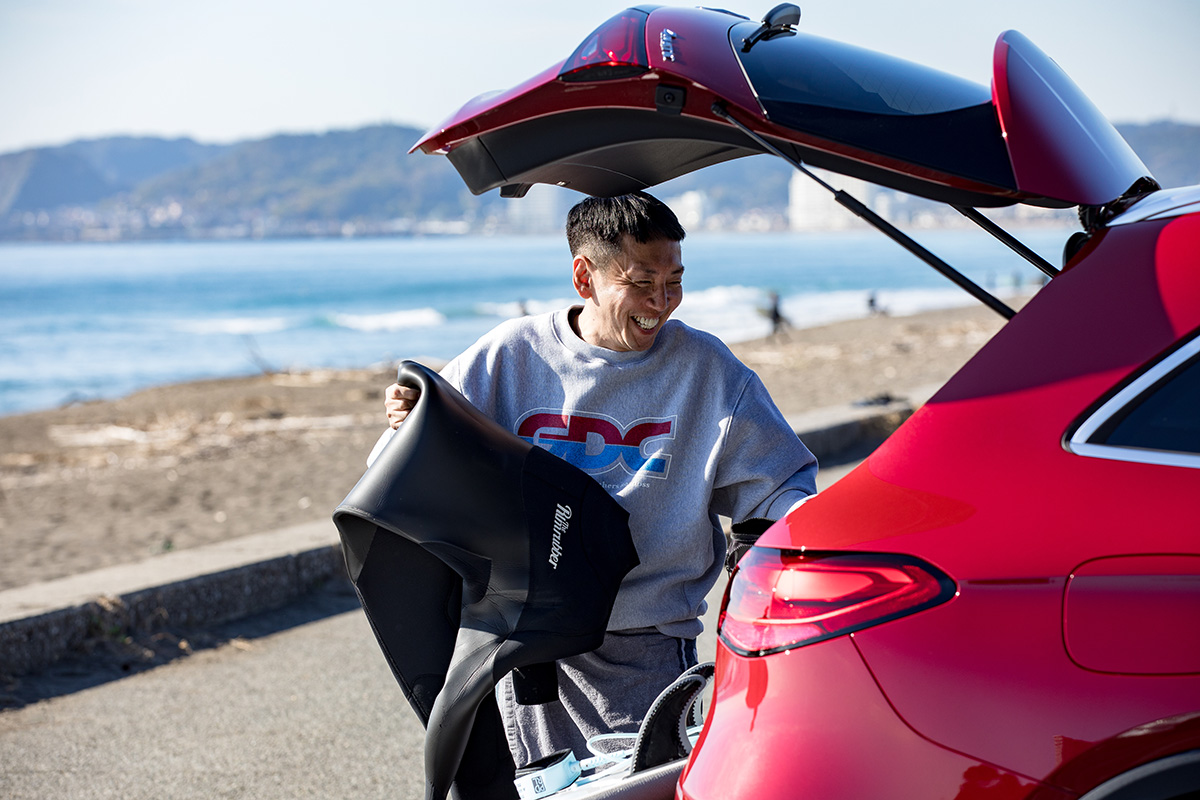 「重厚感と走りの安定感がさすがだなと思いました。メルセデスは大人に似合う、って以前から耳にしていたけど、改めて納得。インテリアは上品だし、運転しやすく、安心感がヤバい。母親にもプレゼントしたい、って思いましたね。GLCはメルセデスの中でも肩の力を抜いて付き合えるモデル。サーファーにぴったりじゃないかな」
