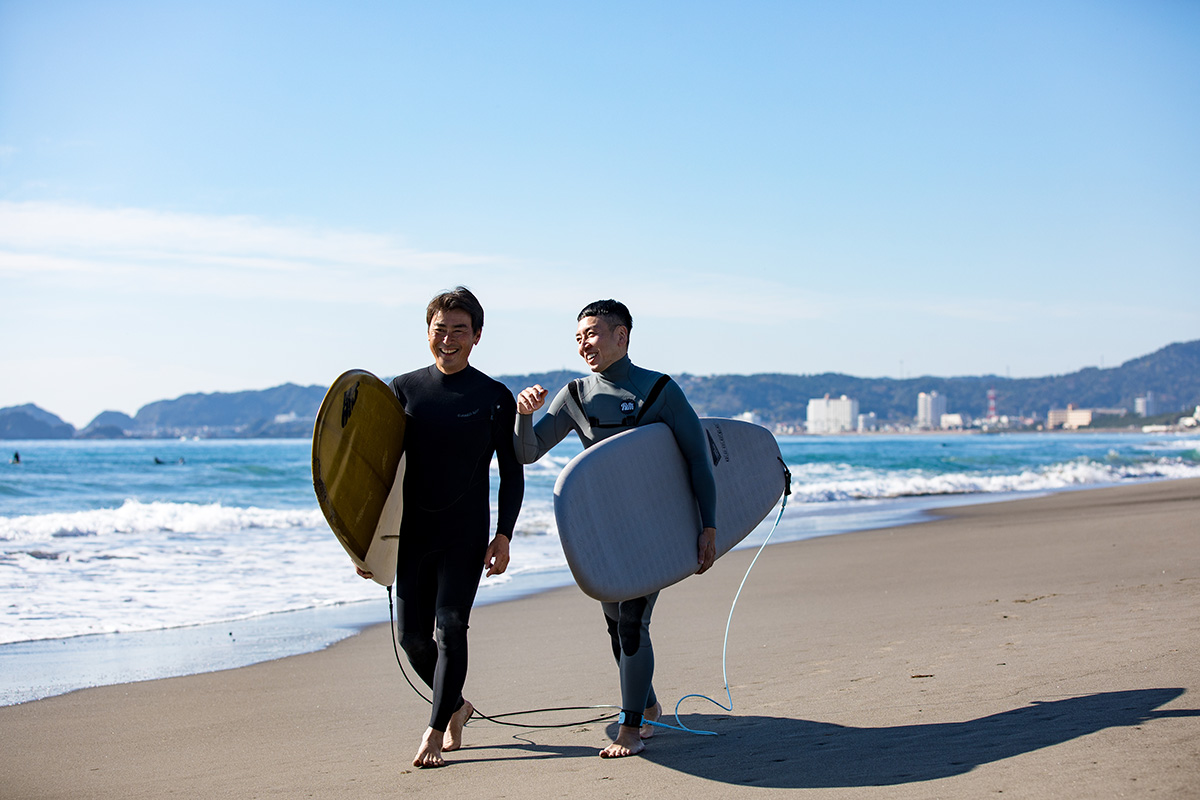 南房総に暮らす吉川祐二プロとはサーフィンをきっかけに親しい仲へ。各地のサーフポイントを巡るたびに友人が増えていく。これもまたPESにとってのサーフィンの魅力なのだ。