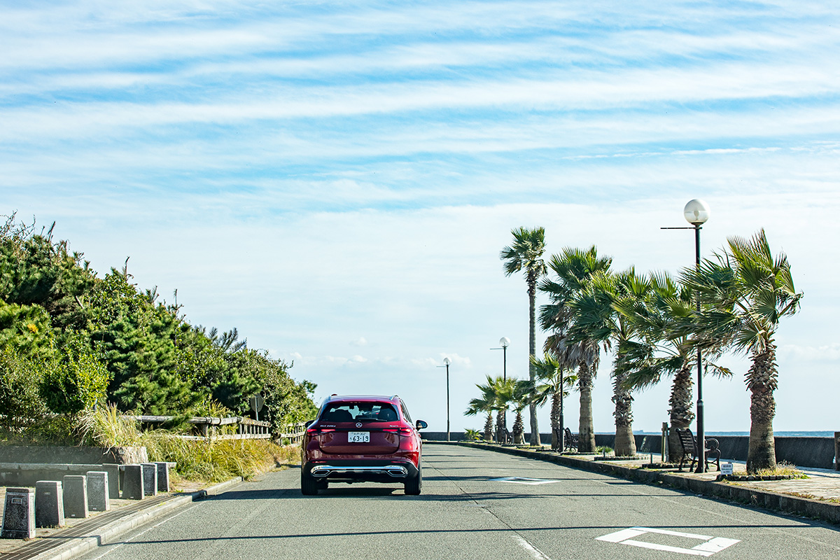 椰子の木が生い茂り、冬でも南国情緒溢れる南房総。目的地のサーフポイントは、澄み切った海の色が美しく、サーファーの数もまばら。これなら存分に楽しめそう、とGLCの車内から笑みが溢れる。地元のプロサーファーも誘い、一緒にサーフィンをすることにした。