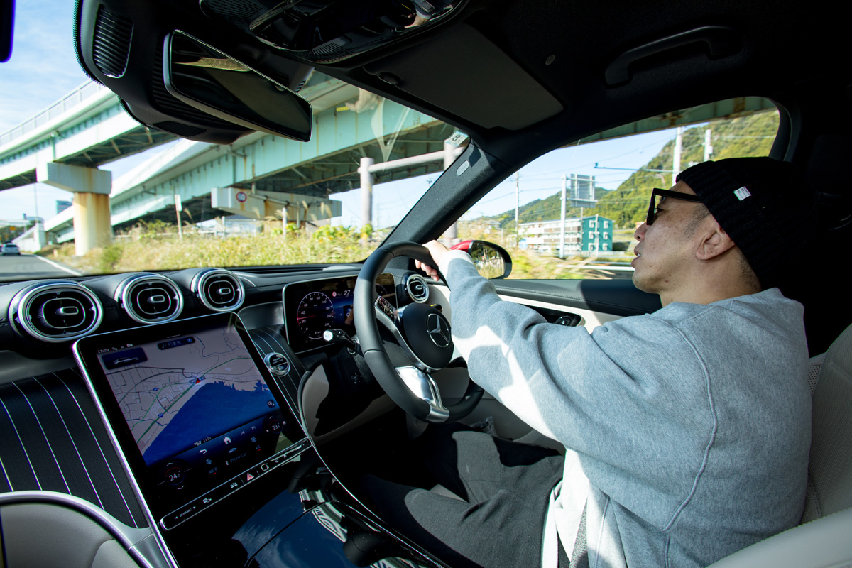 「今回GLCに乗って感じたんですが、ユーザーインターフェイスが素晴らしい。快適だし、視認性に優れている。タッチパネルを押した時、フィジカルに訴えかけてくる感触もありました。街中の低速ではハンドルがすごく軽くて扱いやすいんですよ。でもスピードが乗ってくると手応えがしっかりしてきて、走りがすごく安定する。長距離で移動する自分みたいなサーファー&ミュージシャンには、この安心感は本当にありがたいですね」