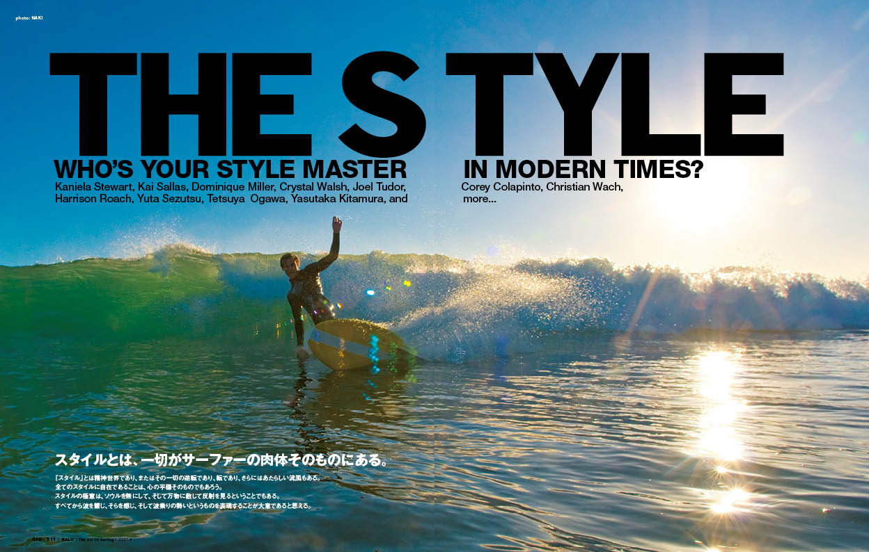 ■Special Gallery: THE STYLE今号の巻頭スペシャルギャラリーでは、ナルーが注目するサーファーやスタイルマスター達と共に、サーフィンにおけるスタイルというものについて語り合い、そんな彼らが輝くモーメントを集めてみました。サーフィンに紐づく“スタイル”は様々ありますが、最も大切なものは? 美しいフォトグラフィックとリアルな言葉で、サーフィンの本質に近づいていただければ本望です。