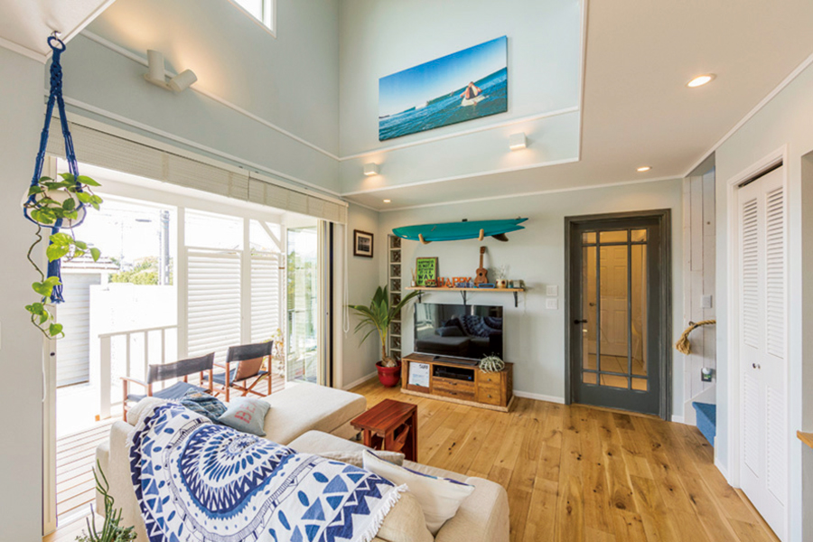 サーファーっぽさを求めるならリビングの天井は高く開放的に、そして、はりなどの骨組みをあえて見せる構造がお勧め。お気に入りのボードをディスプレイしてソファでくつろぎながら鑑賞したい。