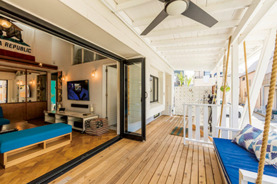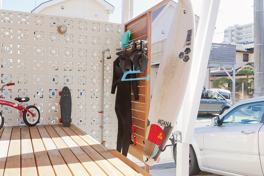 サーファーは、自然との間に壁を作らない。家の中と外をつなぐ「カバードポーチ」やウッドデッキがあれば、より心地よい暮らしが楽しめそうだ。風を感じる空間で、海上がりの時間をゆったりと過ごしたい。
