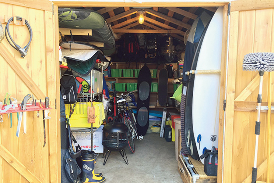 場所を取りがちなロングボード、シーズン外のウエットスーツなどを収納できる専用スペースやガレージがあると便利。波に合わせてチョイスできるよう、ボードはすぐ取り出せる場所に置いておきたい。