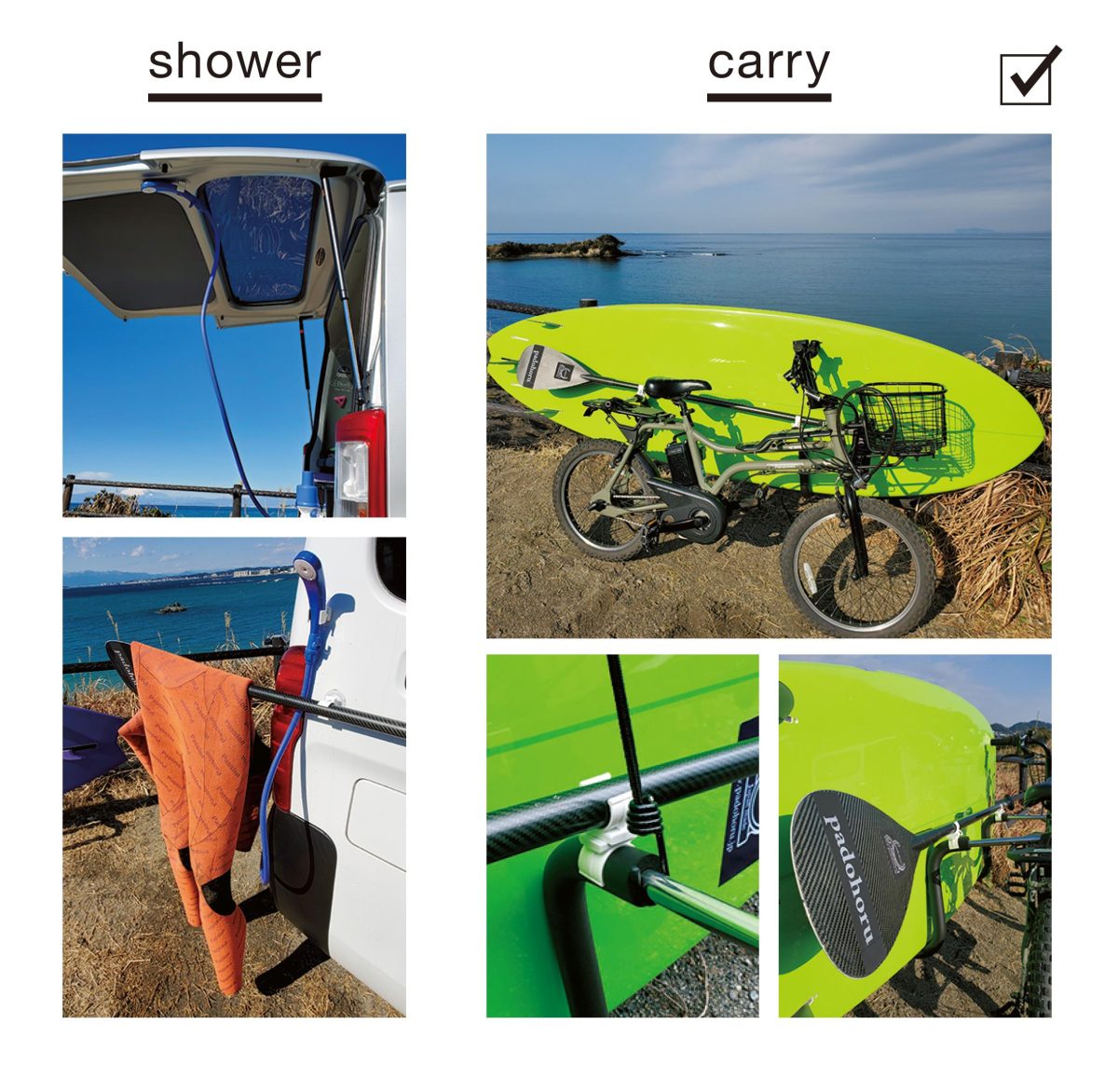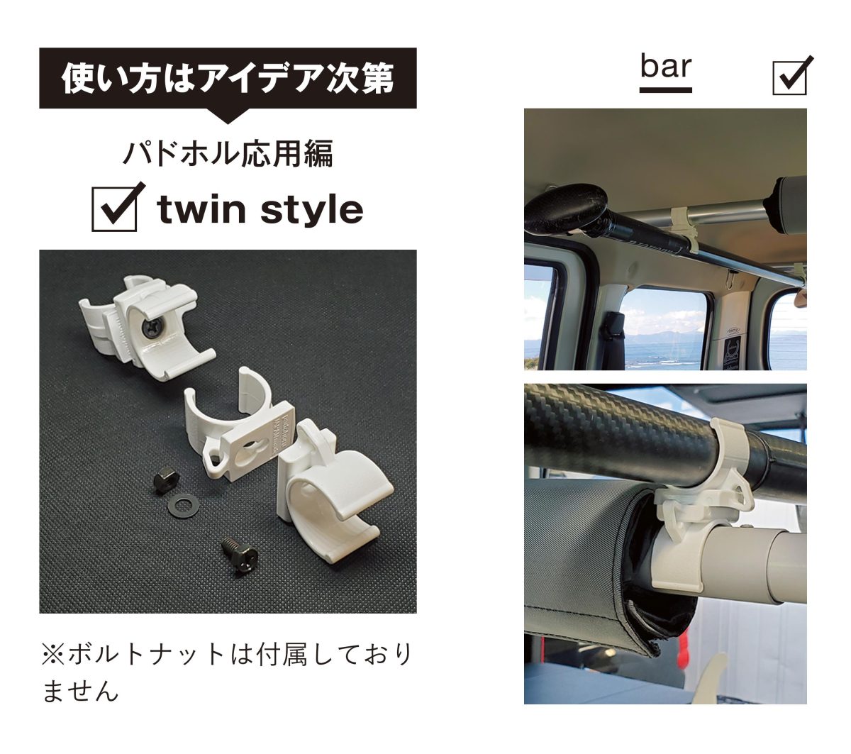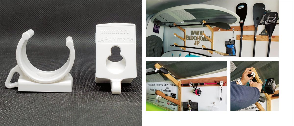 パドホルは大切なパドルの日頃の管理からアクティビティ、準備・片付けと『ちょっと今だけパドルを手放したい!』。そんなシーンのアイテムとして、釣り・シュノーケリング・ヨガ・ツーリング・ドッグサップ等、デッキスペース確保や簡易ロッドホルダーとしても使えます。またアクティビティ後の片付け時にシャワーヘッド掛けにしたりと、使い方はアイディア次第のパドルホルダーです。パドホルは一般的なシャフト径28 ~ 30㎜にジャストフィット(全てのパドルやボードに対応ではありません)。ホームページにてお得な10% OFFクーポン発行中!