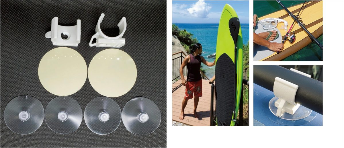 ハードボード用。下地シールを張り付ける事で吸着力がアップ。*パドルの自重を計算したカラビナフック用通し穴でボードに圧をかけ固定するので、フックは下側に