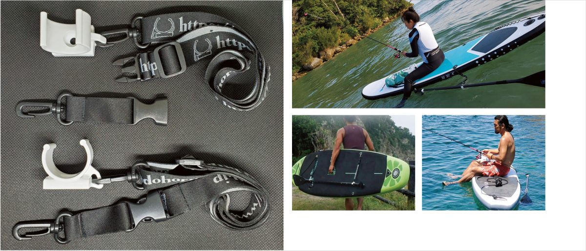 インフレータブル(エア)ボードのD リング、又はリーシュカップやレールセイバーに取り付け可能。ストラップは長さ調節(450㎜~ 600㎜)可能。バックル(ブレイカブル)式のため、途中で脱着も可能