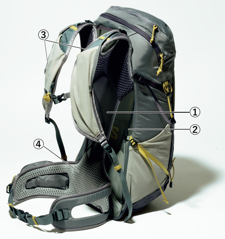 背面の中央部分はトランポリンのように弾力のあるメッシュパネル。通気性に優れ、さらに背中にも自然にフィットしてくれる。ショルダーハーネスや腰回りのパッド内側もメッシュで蒸れにくい。