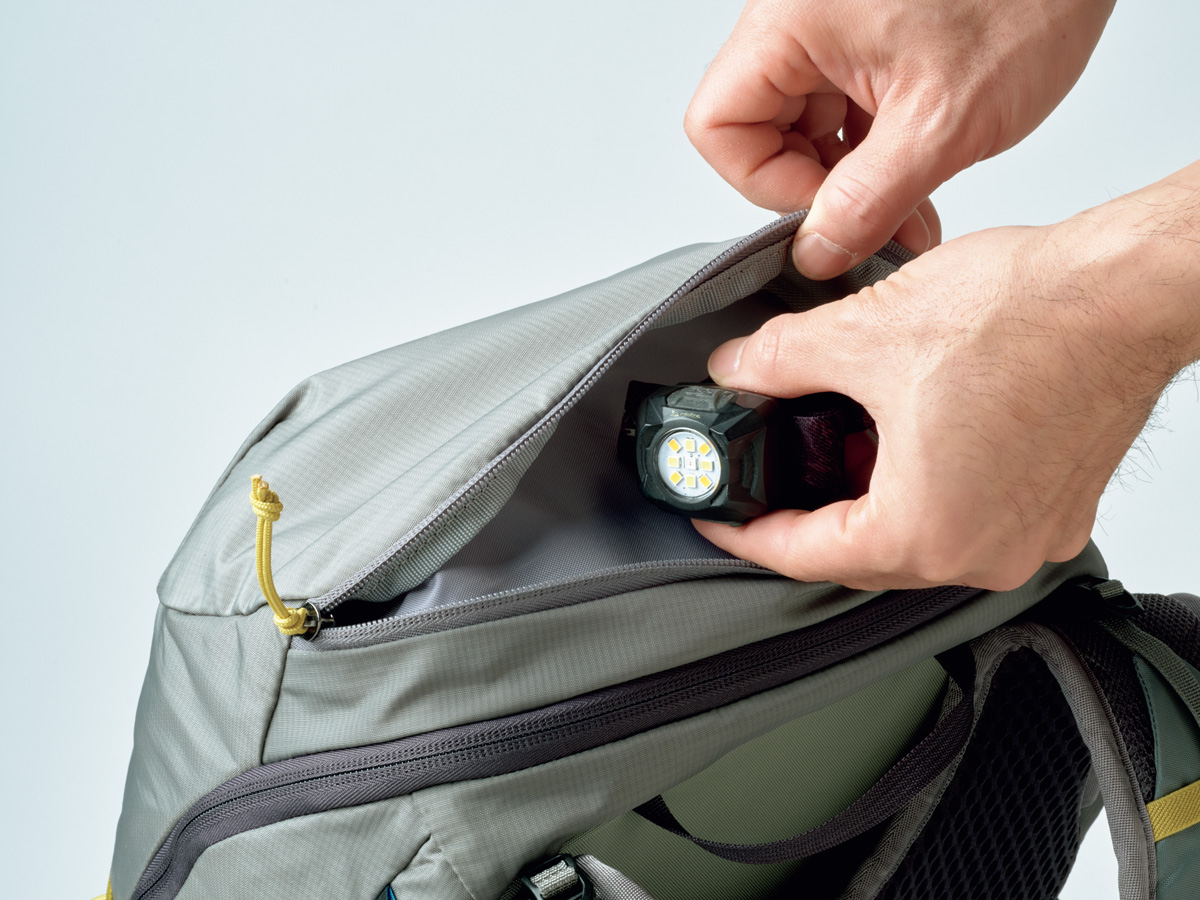 40ℓ、38ℓ以外は雨蓋がないパネルローディング構造。そのためすぐに取り出したいものを収納できるファスナー付きポケットがトップに設けられている。