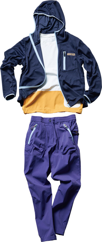 きれい色同士のコーディネート。夏でも温度調整が必要な朝方や日没後、日差しが強すぎる日中に肌を守るなど、脱ぎ着しやすくコンパクトなウエアは必須アイテム。強風時はフード、裾、手首周りをコードやテープで絞り、密着感を上げられる。